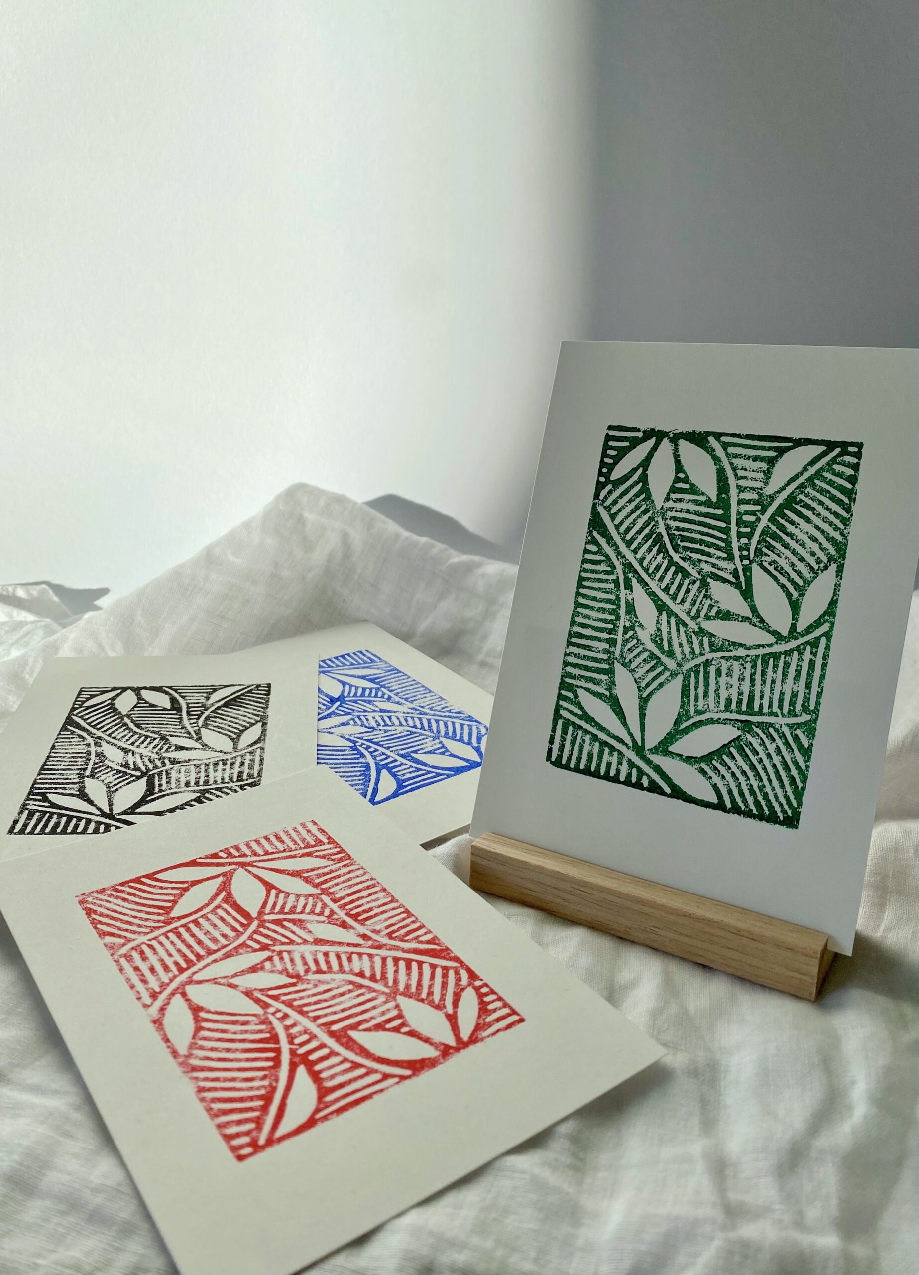Handgedruckte Linolschnitt-Postkarte „Leaflines“ | A6